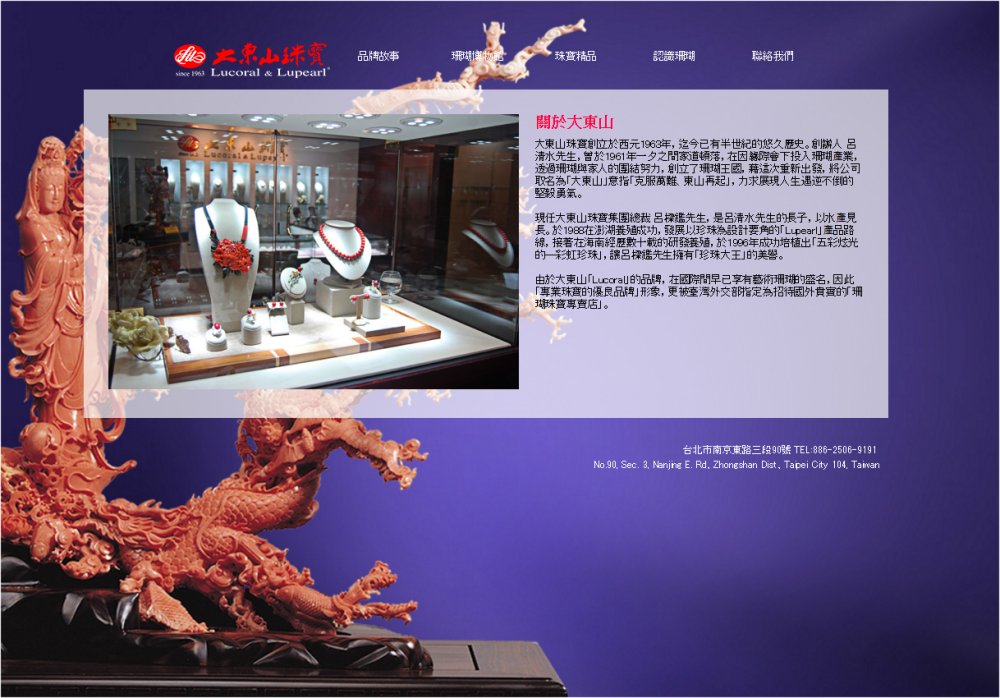 | 事業内容 | 大東山珠寶創立於西元1963年,創辧人 呂清水先生,透過珊瑚與家人的團結努力,創立了珊瑚王國,藉這次重新出發,將公司取名為「大東山」意指「克服萬難、東山再起」,力求展現人生遇逆不倒的堅毅勇氣。 |