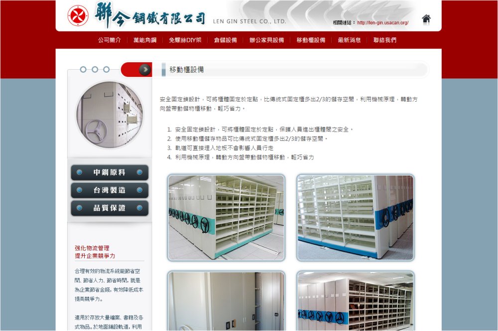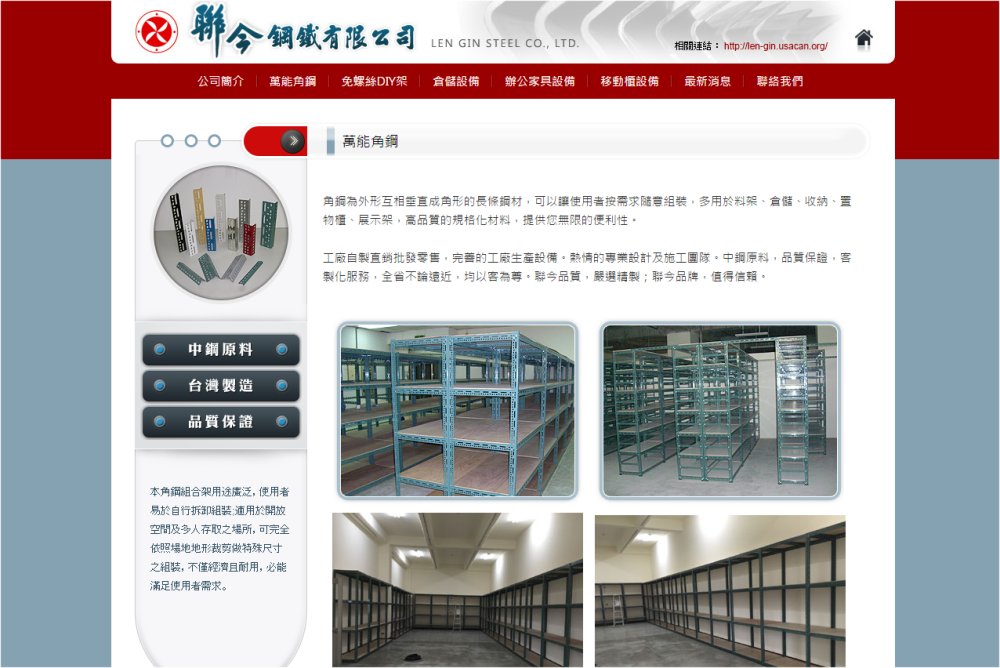 | 事業内容 | 本公司為製造生産各式之倉儲設備,包括萬能角鋼、DIY免螺絲置物架、移動櫃、輕/中/重型量架、OA辧公家具等,設備齊全,品質優良。 |