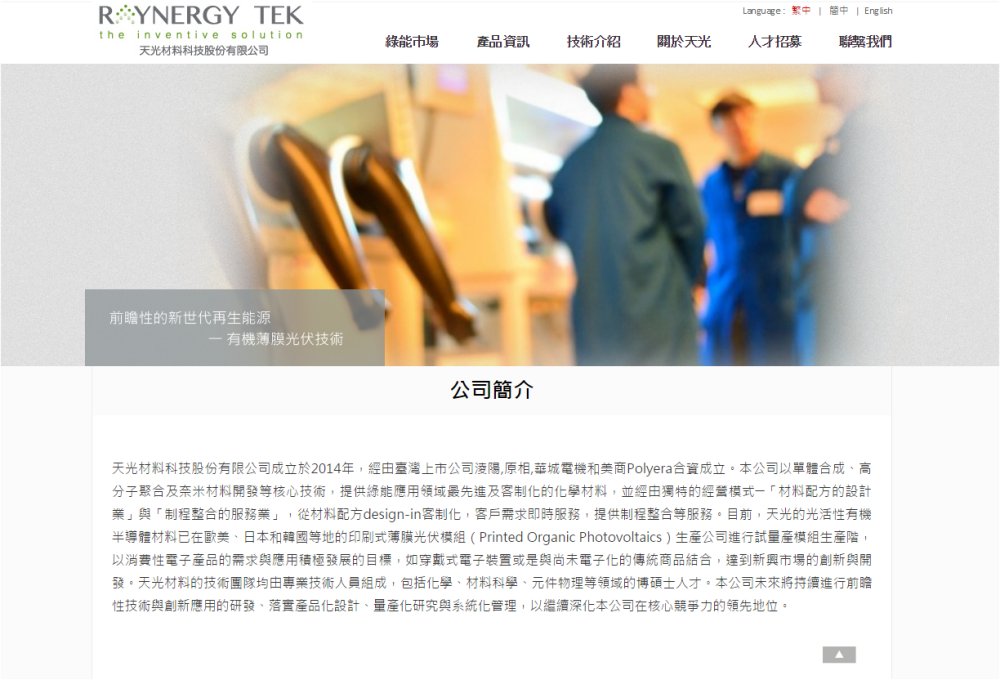 天光材料科技股?有限公司成立於2014年,經由臺灣上市公司?陽,原相,華城電機和美商Polyera合資成立。本公司以單體合成、高分子聚合及奈米材料開發等核心技術,提供鵠\應用領域最先進及客制化的化學材料,並經由獨特的經營模式─「材料配方的設計業」與「制程整合的服務業」,從材料配方design-in客制化,客戸需求即時服務,提供制程整合等服務。目前,天光的光活性有機半導體材料已在歐美、日本和韓國等地的印刷式薄膜光伏模組(Printed Organic Photovoltaics)生産公司進行試量産模組生産階,以消費性電子産品的需求與應用積極發展的目標,如穿戴式電子裝置或是與尚未電子化的傳統商品結合,達到新興市場的創新與開發。天光材料的技術團隊均由專業技術人員組成,包括化學、材料科學、元件物理等領域的博碩士人才。本公司未來將持續進行前瞻性技術與創新應用的研發、落實産品化設計、量産化研究與系統化管理,以繼續深化本公司在核心競爭力的領先地位。