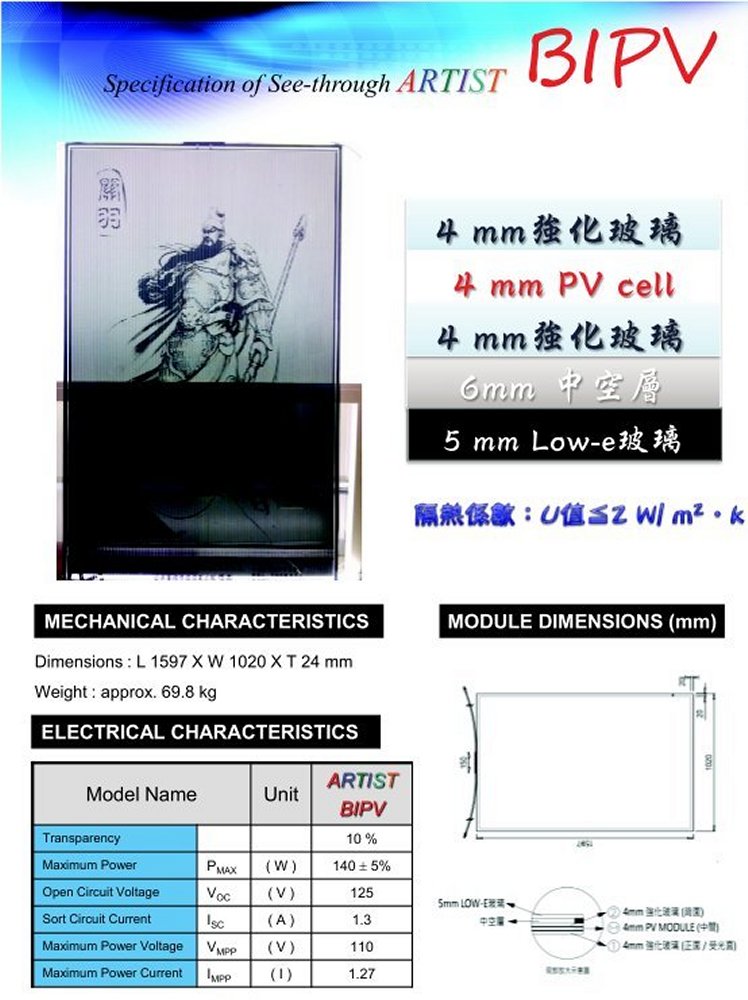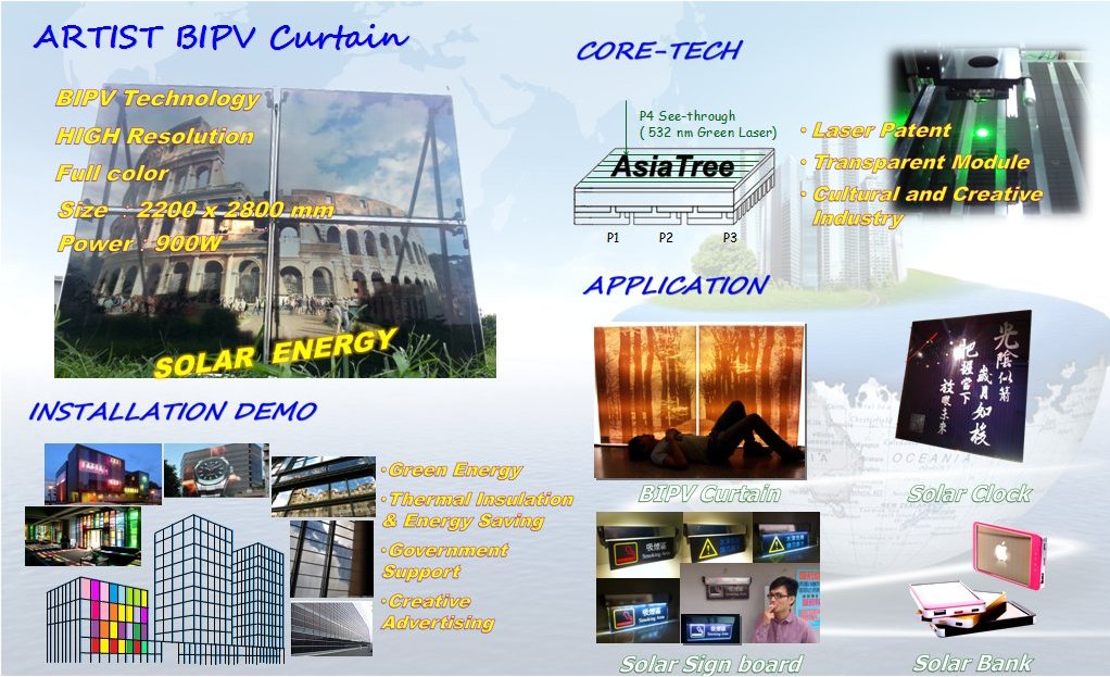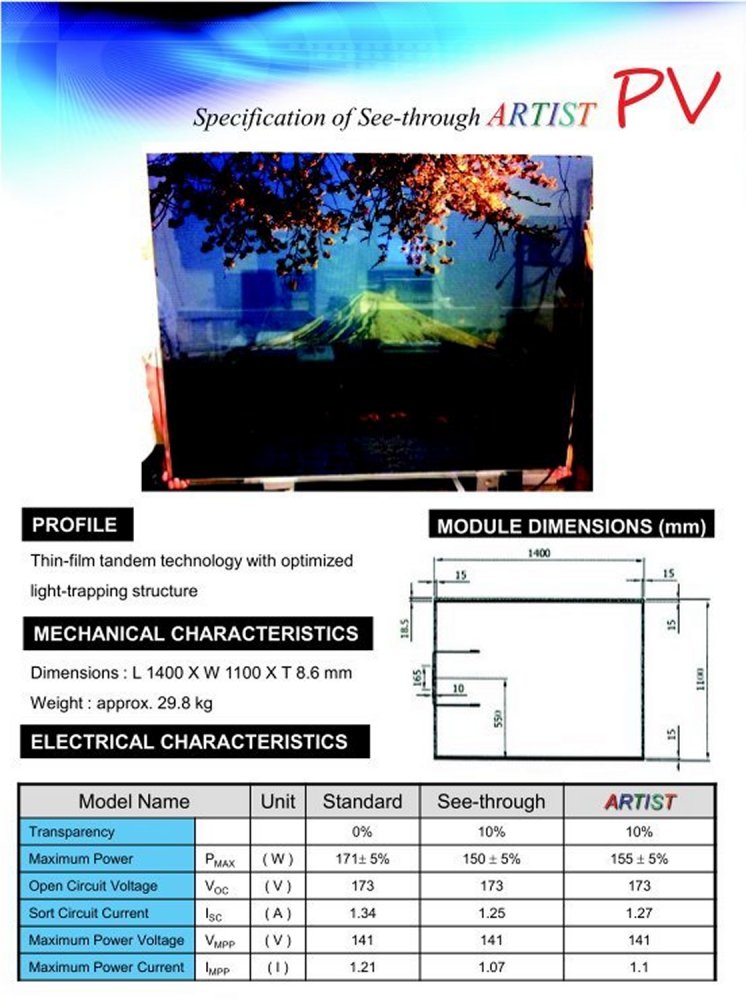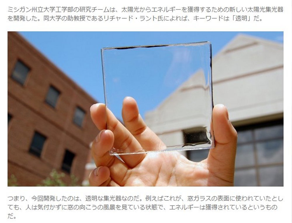 新しい建物のガラス壁面の建設に組み込まれて、透明な建材の中に太陽電池を一体化し、発電所に変えてしまう、または既存の建物が同様の技術を後付けすることもできます。